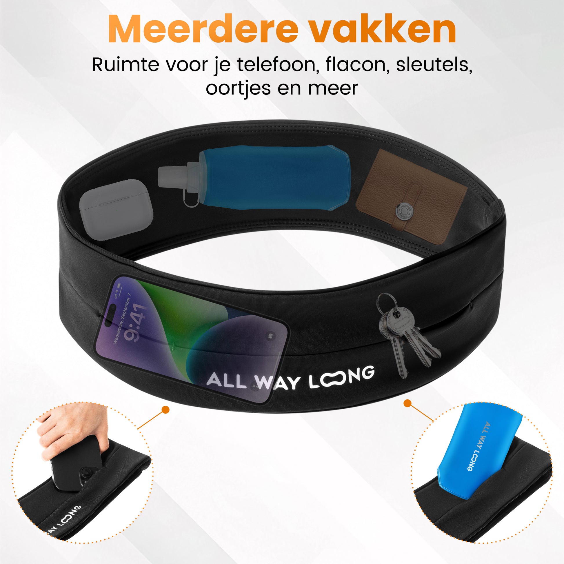Je sleutels die tegen je heup stuiteren, een telefoon die uit je zak dreigt te vallen – tijdens het hardlopen wil je daar geen last van hebben. De ALL WAY LONG hardloopriem biedt dé oplossing: een comfortabele, elastische belt die stevig om je middel zit en niet verschuift. Met meerdere slimme vakken neem je alles mee wat je nodig hebt, zonder dat het in de weg zit.